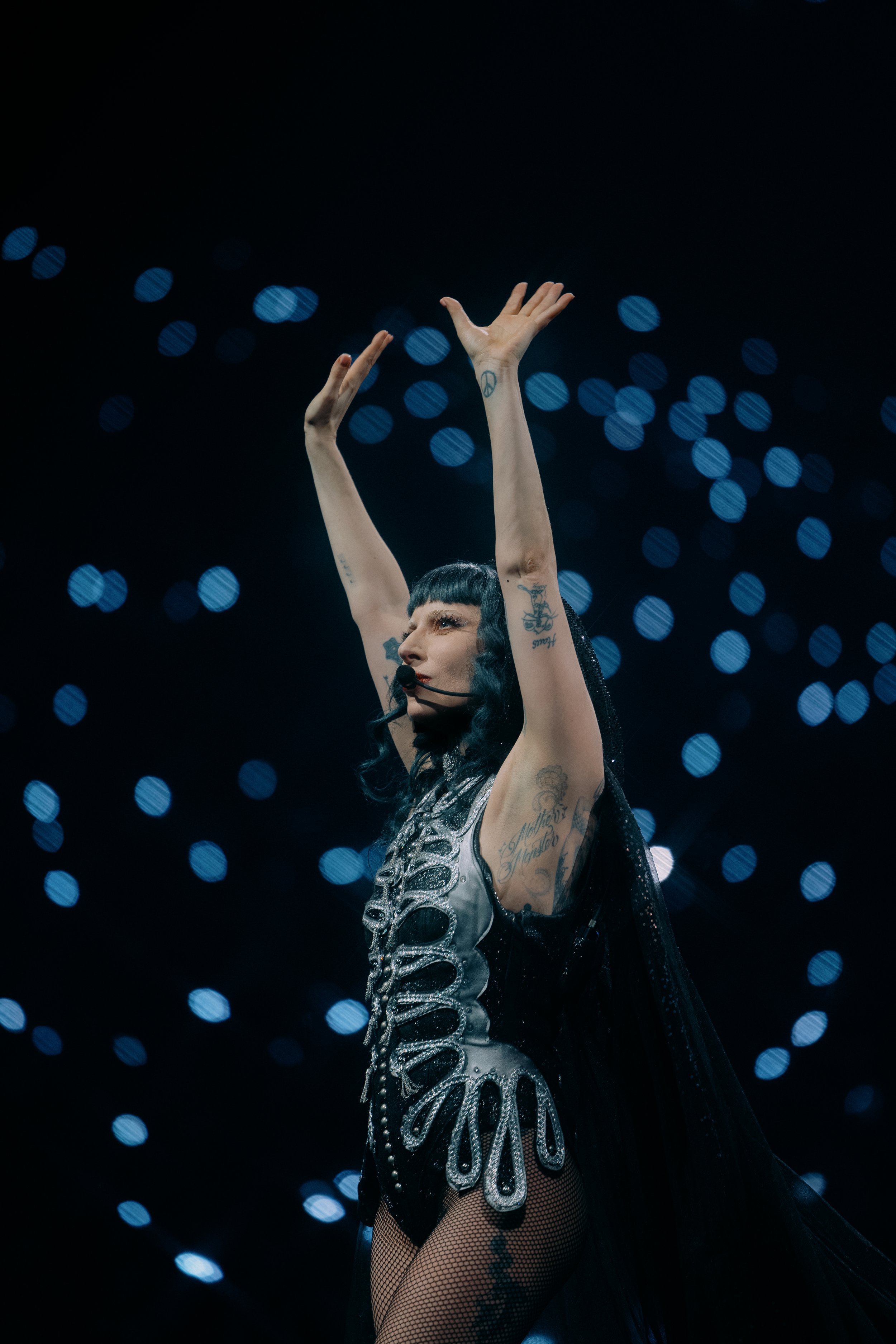 Act II: And She Fell Into a Gothic Dream deepened the spectacle. The lighting softened into bruised purples and midnight blues, as though the arena had been submerged underwater. “Perfect Celebrity” and “Disease” examined fame as both addiction and affliction, her delivery biting yet self-aware. “Paparazzi” was staged like a tragic ballet, evoking the fragility beneath the flashbulbs. “LoveGame” and “Alejandro” pulsed with decadent nostalgia, while “The Beast” closed the act in cinematic darkness, Gaga embodying both predator and prey. Even with cameras gliding through the crowd, capturing every movement for posterity, the performance never lost its immediacy.