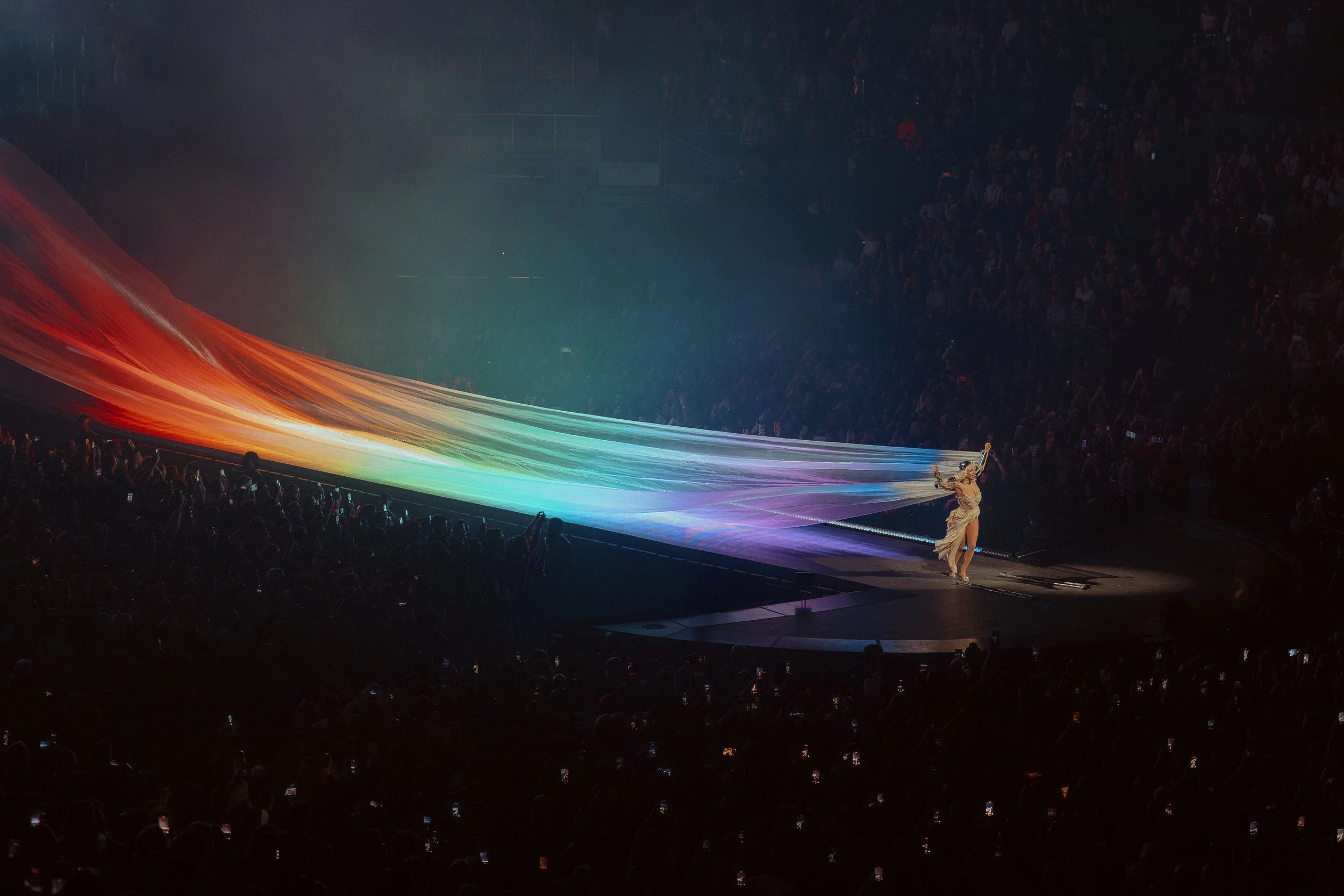 Then came Act IV: Every Chessboard Has Two Queens, perhaps the emotional spine of the evening. The title alone suggested strategy, duality, power shared and contested. “Shadow of A Man” and “Kill for Love” carried a brooding intensity, but the atmosphere shifted when she moved to the piano. “Summerboy” shimmered with nostalgia before she delivered a soaring “Born This Way,” transforming the arena into a sanctuary of affirmation. The transition into “Million Reasons” was stripped-down and raw, her voice unadorned and luminous. “Shallow” echoed with cinematic grandeur, while “Die With a Smile” and “Vanish Into You” bridged past and present, revealing an artist unafraid to let softness exist alongside spectacle.
