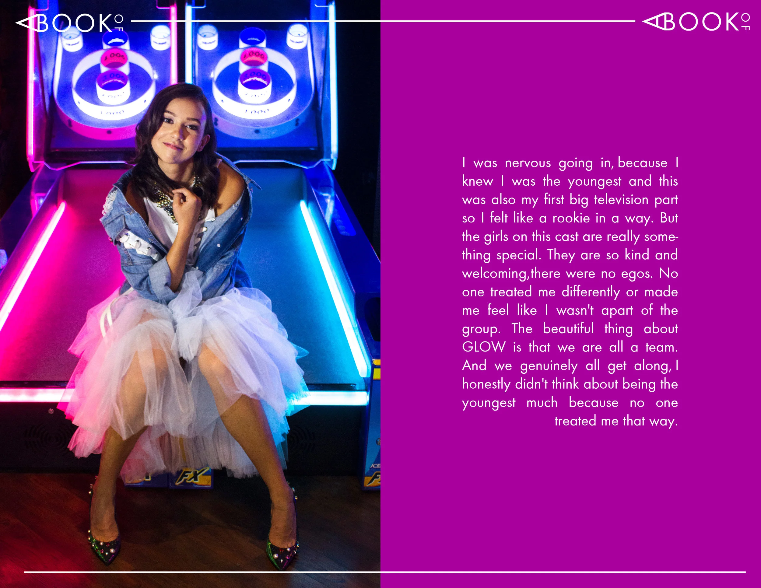 I was nervous going in, because I knew I was the youngest and this was also my first big television part so I felt like a rookie in a way. But the girls on this cast are really something special. They are so kind and welcoming, there were no egos. No one treated me differently or made me feel like I wasn't apart of the group. The beautiful thing about GLOW is that we are all a team. And we genuinely all get along, I honestly didn't think about being the youngest much because no one treated me that way.